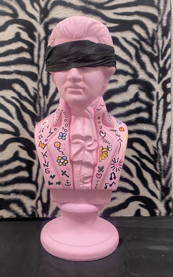 Objeto de arte único. La figura está pintada de rosa y decorada con coloridos garabatos de arte pop, como flores, notas musicales y símbolos. ¡Una venda negra completa la pieza! Esta obra es perfecta para los amantes del arte moderno y pop, y añade un toque atrevido y creativo a cualquier estancia. Queda genial en interiores modernos o eléctricos. Fabricada y vendida por NikV. NikV es una artista con una visión única del arte y del mundo que nos rodea. Su obra se exhibe regularmente en su país y en el extranjero. Además de la influencia del arte pop y el arte callejero, también se aprecian elementos surrealistas en su obra. Cada obra posee una profundidad que invita al espectador a crear su propia interpretación.