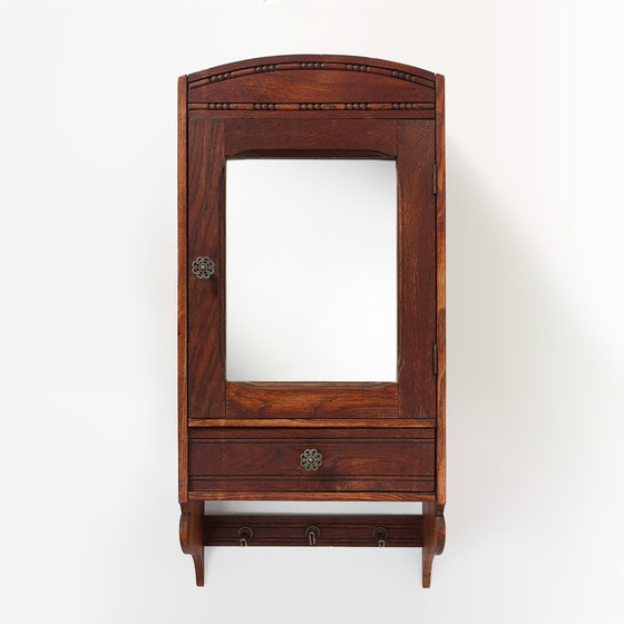 Francia / 1900 / Armario de Afeitar / Roble, Espejo / Art Déco. Armario de pared Art Déco francés en roble con hermosas tallas y puerta de espejo. Este armario de afeitar cuenta con hermosos tiradores y un frontón decorado. En el interior, dos estantes tras la puerta de espejo, un pequeño cajón debajo y tres ganchos. El armario de afeitar o botiquín presenta algunas pequeñas marcas de uso (ver imágenes). Gracias a su tamaño compacto, permite guardar objetos esenciales en el baño, en el pasillo para las llaves y el correo, o en el dormitorio para los accesorios. El espejo integrado no solo realza la estética del armario, sino que también resulta práctico para retoques rápidos o revisiones de última hora antes de salir. Dimensiones interiores: Alto: 40 cm Ancho: 33 cm Fondo: 12 cm Alto Estantes: 10,5 cm y 21 cm Ref. 25-0123