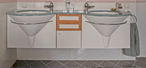 Mueble de baño con una preciosa encimera de cristal de Antonio Lupi. 180 cm de ancho y 53 cm de profundidad en los lavabos, y 34 cm de profundidad entre ellos. Incluye grifería. La encimera de cristal está completamente intacta.