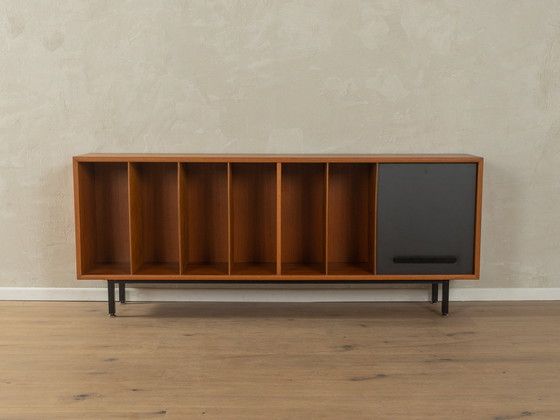 Mueble clásico para discos de los años 60. Cuerpo de chapa de teca con seis compartimentos para discos, un estante para discos, un compartimento secreto y nuevas patas cuadradas de acero en negro. Fabricado en Alemania. Fabricante: WK Möbel. Ref. 2502090.