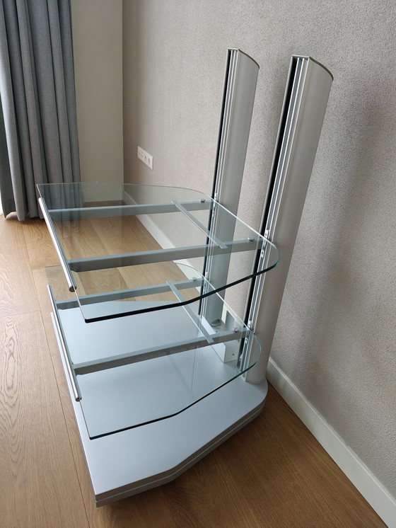 Se vende por reforma interior: mueble para TV/Hi-Fi de diseño Galotti y Radice, modelo "Yuppie Wide". El mueble cuenta con dos estantes de altura regulable de vidrio templado de 8 mm, con medidas de 88 x 60 cm (An x Pr), además de un estante de vidrio opcional más pequeño de 55 x 43 cm (An x Pr), con soporte ajustable (no se muestra en la imagen). El estante base de madera lacada mide 88 x 65 cm (An x Pr). El mueble cuenta con cinco ruedas, lo que facilita su desplazamiento. Los montantes a los que se fijan los estantes de vidrio son de aluminio anodizado. Compramos el mueble de TV hace aproximadamente 16 años en Middelman Wonen, Soest. Lo hemos tratado con mucho cuidado, lo que se refleja en su perfecto estado. Lo vendemos por mudanza a una vivienda más pequeña. Los electrodomésticos no están incluidos en la venta. El mueble también podría utilizarse como vitrina para artículos de lujo o similares.