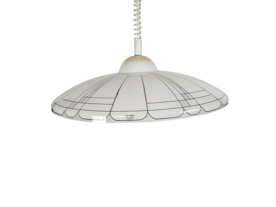 Revive el optimismo futurista de los años 70 con esta original lámpara colgante Meblo de Yugoslavia. Con su amplia cúpula, decorada con una cuadrícula geométrica de líneas negras y suspendida de un icónico cable en espiral, esta lámpara es un ejemplo impactante del movimiento de diseño de la era espacial que arrasó en Europa a mediados de siglo.