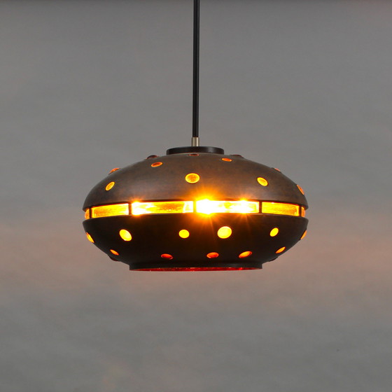 La lámpara colgante consta de una capa exterior de cobre y una capa interior de vidrio de color amarillo. La técnica utilizada para fabricar estas lámparas se inventó en Murano (Italia) y también se conoce como "vidrio enjaulado". El vidrio se sopla en el cobre mientras éste se calienta. El calor extremo deteriora y decolora el cobre. Después es imposible retirar el vidrio.