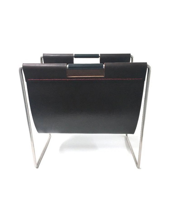 Revistero/soporte para portátil completamente hecho a mano, inspirado en un revistero vintage de Brabantia. Elegante soporte de cuero marrón, estructura de acero inoxidable con asas de madera lacada en negro. Este revistero también sirve para guardar el portátil.