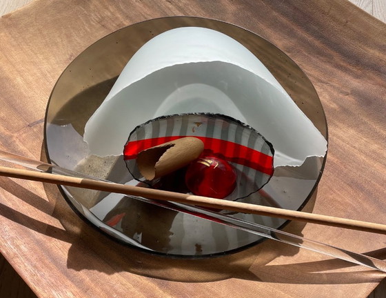 Objeto único de vidrio "BANTEN" del artista vidriero holandés Frank van den Ham. Hecho con seis piezas de vidrio y tres de madera. La composición reposa sobre una hermosa bandeja de madera de 50 x 50 cm. ¡Algo realmente especial!