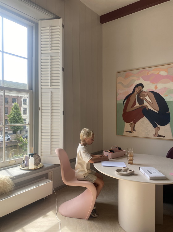 Dale un toque de color y emoción a tu hogar con esta impresionante obra de arte de Annemei Poppe. Esta pieza moderna captura un tierno momento entre dos figuras, con un fondo onírico de tonos rosas y verdes vibrantes. Es perfecta para añadir calidez y personalidad a cualquier habitación.