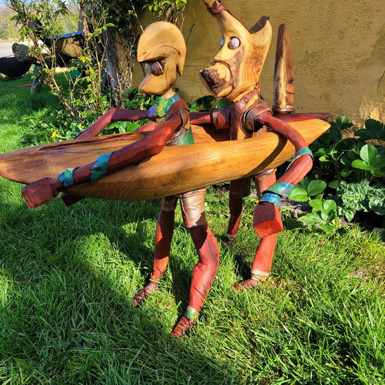 Figura de acacia y madera de peral. Fabricada en 2025. Decorada y rematada con plomo pintado. 50 cm de alto, 55 cm de largo y 35 cm de ancho. 450 € cada una.