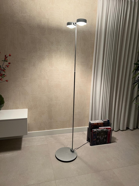 Lámpara de pie Occhio Terra en aluminio mate (con 2 bombillas halógenas de 150 W). Incluye lentes mate. El regulador de intensidad se ha retirado debido a un defecto. Por lo demás, está en excelentes condiciones, sin daños.
