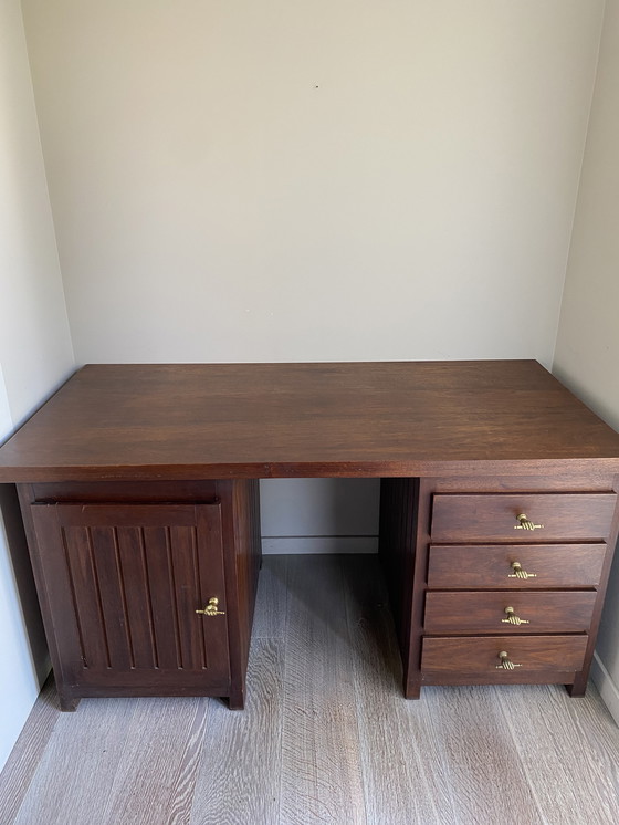 Este escritorio de madera de estilo vintage combina funcionalidad con encanto clásico. Con un elegante acabado en marrón intenso y tiradores de latón únicos, ofrece amplio espacio de almacenamiento gracias a un armario y cuatro cajones. Ideal para añadir un toque de elegancia a tu espacio de trabajo.