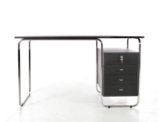 Escritorio COMACINA de Piero Bottoni para Zanotta. En 1930, el arquitecto Piero Bottoni diseñó el escritorio Comacina, ahora fabricado por la empresa Zanotta. Este escritorio, de líneas sencillas, es característico del enfoque racionalista de Bottoni, con su estructura de tubo de acero inoxidable 18/8 y su cajonera integrada en la base. El tablero y la cajonera del Comacina están fabricados en un material antirayaduras negro. Este icónico escritorio de diseño moderno, con sus dimensiones compactas, se integra a la perfección en cualquier interior. Escritorio, edición reciente adquirida en 2020. Estado usado, con microrayones imperceptibles en el tablero.