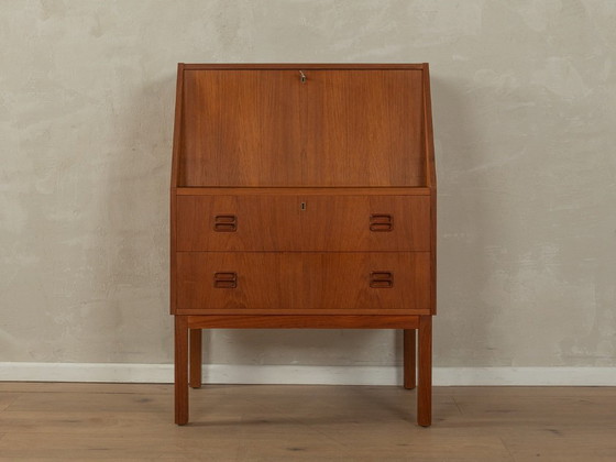 Buró clásico de los años 60. Corpus de alta calidad en chapa de teca con superficie de escritura abatible, dos cajones interiores, dos cajones grandes y patas cuadradas de madera. Hecho en Dinamarca, fabricante: AEJM Møbler.