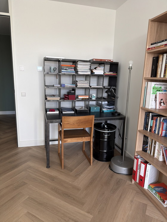 Presentamos el escritorio 'Postkantoor', una representación excepcional del diseño industrial que combina a la perfección funcionalidad y atractivo estético. Este escritorio es la opción ideal para quienes aprecian un espacio de trabajo práctico y visualmente impactante.\n\n- Fabricado en metal resistente y con una silla de madera, este escritorio promete durabilidad y una apariencia atemporal.\n- Su estilo industrial se acentúa con un acabado de metal crudo y un diseño centrado en la practicidad, lo que lo convierte en una adición versátil a cualquier oficina o estudio moderno.\n- Las estanterías integradas ofrecen un amplio espacio de almacenamiento, perfecto para organizar libros, documentos y material de oficina.\n\nEleva tu espacio de trabajo con el escritorio 'Postkantoor', donde la forma se une a la funcionalidad de una manera verdaderamente única.
