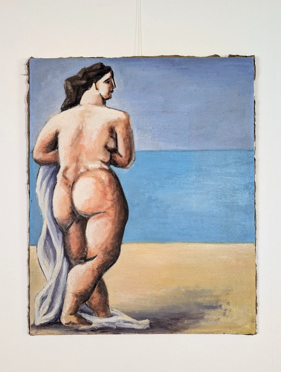 Óleo sobre lienzo de gran formato que representa una figura femenina sentada en la playa, pintada en tonos cálidos con pinceladas sueltas y expresivas. El estilo recuerda las escenas costeras de Picasso, como "Mujeres junto al mar" o "Trois femmes à la plage", con formas simplificadas y una fuerte presencia gráfica. La figura, contemplativa y segura de sí misma, se enmarca en un paisaje marino ligeramente sugerido, lo que añade una dimensión poética a la imagen. La obra no está firmada, lo que refuerza su carácter enigmático y abierto. En el reverso del lienzo, una vibrante composición abstracta, probablemente del mismo artista, añade una capa adicional de experimentación e interés.