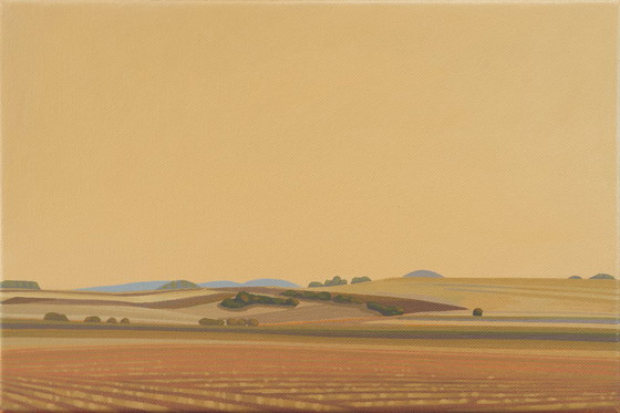 Olas azules parecen formarse en el horizonte tras los campos dorados, bajo un radiante cielo de verano y una vista panorámica de suaves ondulaciones. La pintura representa un paisaje típico de la hermosa región de Eifel, en el oeste de Alemania. La obra original está firmada en el reverso.