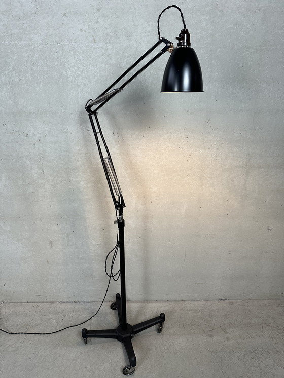 Excepcional lámpara de pie Anglepoise modelo 1209, fabricada por Herbert Terry & Sons, Redditch, Inglaterra. Este ejemplar de la década de 1940 tiene una base alta con ruedas. Cableado renovado con cable trenzado negro. Casquillo de baquelita con interruptor. Ajustable en altura. Pantalla lacada en negro con una pequeña abolladura aquí y allá, móvil en todas direcciones. Marcada. Posición más baja y uso normal: 140 cm. Posición más alta y uso normal: 220cm. Por supuesto, el ángulo de los brazos sigue siendo infinitamente ajustable. Diámetro de la base: 48 cm. Profundidad en uso normal: 60 cm.