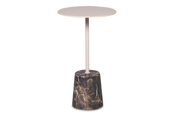Pequeña mesa auxiliar Painite de la colección DMO / dimensiones Ø32x55hg / tablero de metal color champán / base de mármol negro Las imágenes mostradas son una representación real del producto.