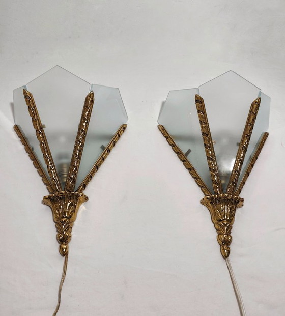 Este par de apliques de pared de bronce, originarios de España en la década de 1980, representa una fusión exquisita de diseño clásico y funcionalidad moderna. Con un diseño geométrico distintivo, estas piezas añaden un toque de elegancia a cualquier espacio, iluminando con suavidad y estilo.