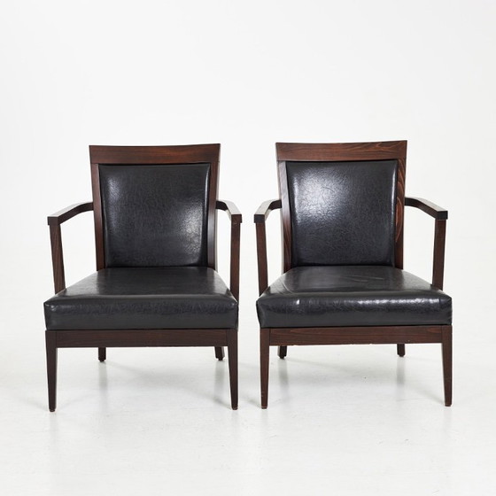 Introducing a distinguished pair of TON Bentwood Armchairs, crafted with precision in the Czech Republic. These armchairs are a testament to timeless design, featuring a dark-stained beech frame that beautifully complements the luxurious black leather upholstery.