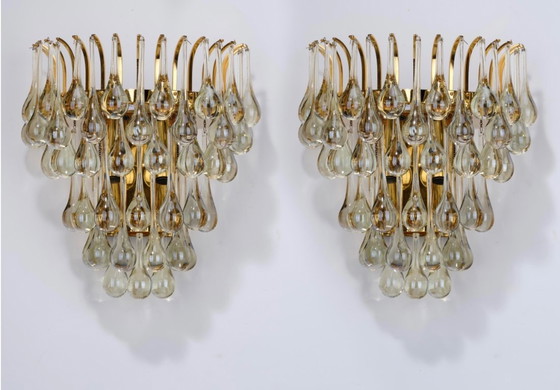 Ilumine su espacio con la elegancia atemporal de este exquisito par de apliques Palwa de la década de 1970. Estos impresionantes apliques son un testimonio del lujoso diseño y la artesanía de la época, con gotas de cristal en cascada que brillan con cada rayo de luz.