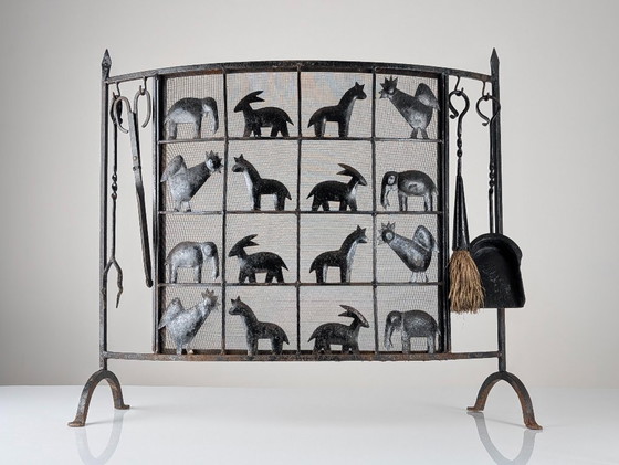 Funcionalmente, la pantalla incorpora un juego de herramientas para chimenea que cuelga de ganchos forjados en los montantes laterales. El juego incluye un cepillo, un recogedor, un atizador y tenazas, todos elaborados con elementos estilísticos a juego. El ensamblaje se basa en técnicas tradicionales de herrería, enfatizando el carácter industrial y artesanal de la metalistería típica de los diseños de Marolles de mediados del siglo XX.