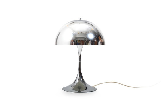 Rara Panthella cromada de Verner Panton (1926-1998). Producida por Louis Poulsen, Dinamarca, década de 1970. Dimensiones: Alto 70 cm / Diámetro de la pantalla: 50 cm / Diámetro de la base: 34 cm.