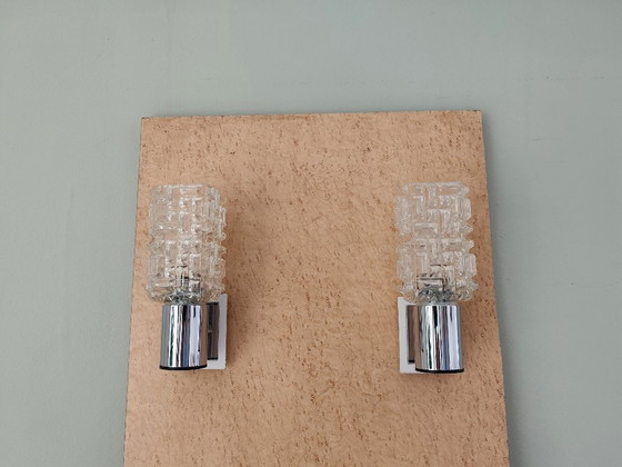 Estos apliques, que datan de la década de 1970, se distinguen por su sofisticada estética, que combina una base de metal cromado con un difusor escultural de vidrio texturizado de forma cuadrada que crea un elegante y cálido juego de luz.