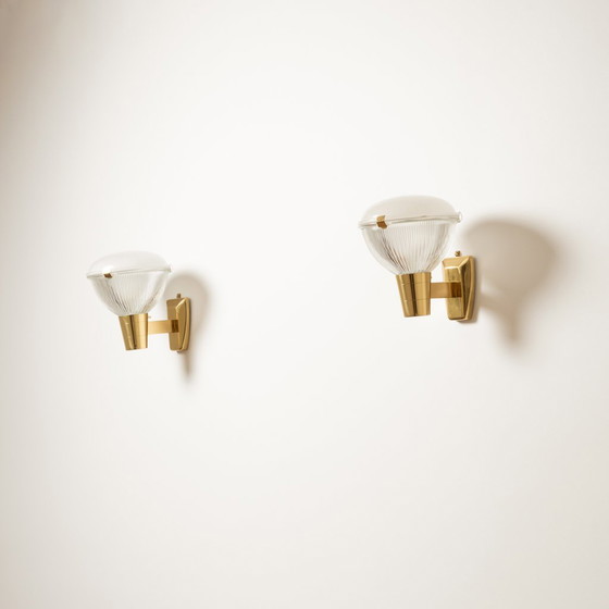 Pareja de apliques de pared con marcos de latón y difusores de cristal Zeiss. Fabricados por Stilnovo en la década de 1950. Conservan la marca del fabricante. Muy buen estado.
