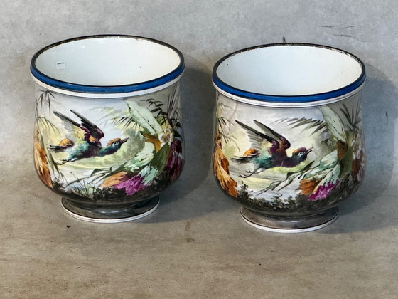 Este exquisito par de macetas ofrece una elegancia atemporal que realzará cualquier ambiente. Elaboradas en fina porcelana, estas piezas están adornadas con vibrantes representaciones de aves y follaje pintadas a mano, creando una escena llena de vida que captura la belleza de la naturaleza.