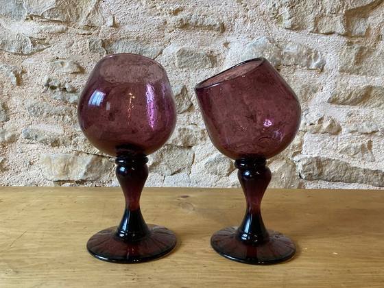 Impresionantes y excepcionales cuencos de vidrio soplado y burbujeado, teñidos de púrpura. Originarios de la región de Biot (Alpes Marítimos), famosa por su artesanía vidriera, no están firmados.