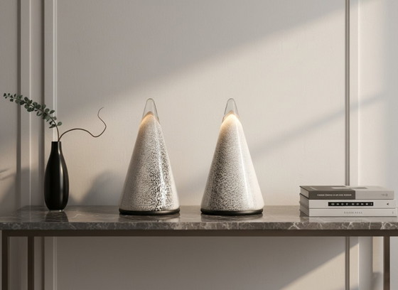 Elegante par de lámparas de cristal de Murano, elaboradas en la década de 1980, con una llamativa forma cónica. Cada lámpara está hecha de cristal transparente y blanco, con detalles moteados en negro que crean un refinado juego de texturas y luz. El diseño realza la transparencia del cristal de Murano, a la vez que aporta una presencia escultural que refleja la experimentación y la creatividad de la cristalería italiana de aquella época. Ambas lámparas cuentan con un regulador de intensidad de luz, que permite diferentes niveles de brillo para realzar los sutiles contrastes del cristal. Su silueta geométrica, combinada con el equilibrio entre opacidad y transparencia, confiere a estas lámparas un poder decorativo y un atractivo atemporal.