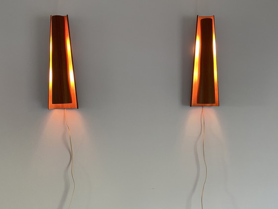 Dos excepcionales lámparas de pared vintage de Henning Wind-Hansen para Voss Belysning son un bello ejemplo del diseño moderno de mediados de siglo. Fabricadas en madera curvada, presentan una elegante forma cónica que proyecta una luz cálida y acogedora al encenderse. Perfectas para añadir un toque de encanto sesentero a cualquier estancia.