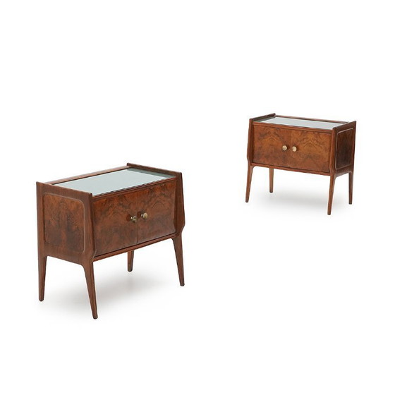 Pareja de mesitas de noche de madera de raíz, fabricadas en la década de 1950, con elegantes vetas espejadas y bordes suavemente redondeados. El tablero de cristal lacado en verde aporta un toque distintivo de la época, mientras que las dos puertas principales conservan sus tiradores de latón originales. Una pareja refinada, perfecta para dormitorios de mediados de siglo o interiores contemporáneos que necesitan un toque cálido y decorativo.