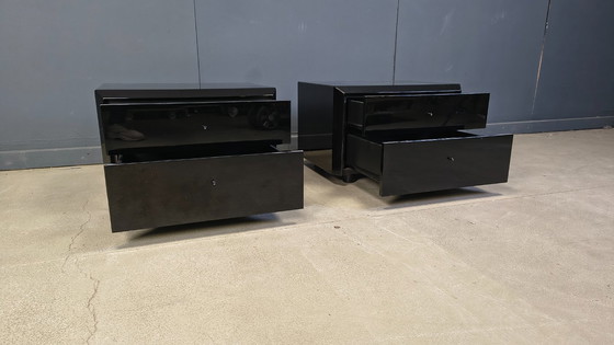 Par de mesitas de noche vintage lacadas en negro de Interlubke.