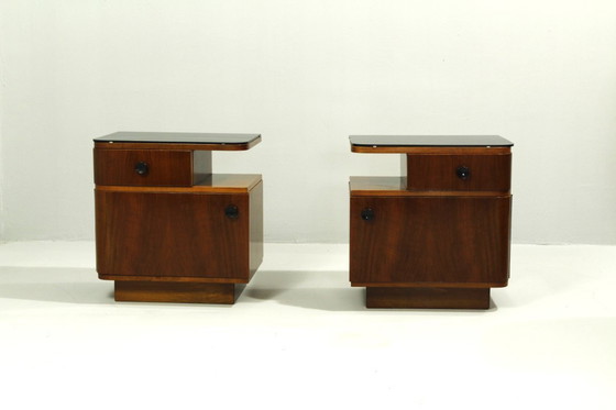 Un par de mesitas de noche checas con tapas de cristal opalino negro. Fabricación de fábrica de alta calidad. Chapadas en nogal. Las mesas se encuentran en muy buen estado original, con una sutil pátina.