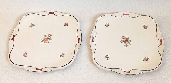 Par de platos de postre, Manufacture Moulin des Loups St Amand. Fabricados en Francia. Estos platos cuadrados de porcelana con bordes acanalados, bordes rojos y decorados con pequeños ramos de flores rojas, verdes y amarillas en las cuatro esquinas están en buen estado. Presentan algunas señales de uso (ver fotos). Dimensiones: ancho 18,1 cm, fondo 18,1 cm, alto 1,1 cm. Peso sin embalaje: 400 g. Empaquetado cuidadosamente. Envío con seguimiento.