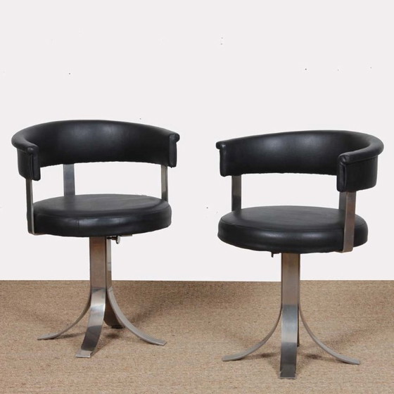 Este modelo de silla, atribuido al diseñador italiano Osvaldo Borsani, data de la década de 1970. La estructura es de acero cromado, mientras que el asiento y el respaldo están tapizados en polipiel negra. Montadas sobre una base central de cuatro radios, son giratorias, ofreciendo comodidad y funcionalidad. El conjunto se encuentra en buen estado original.