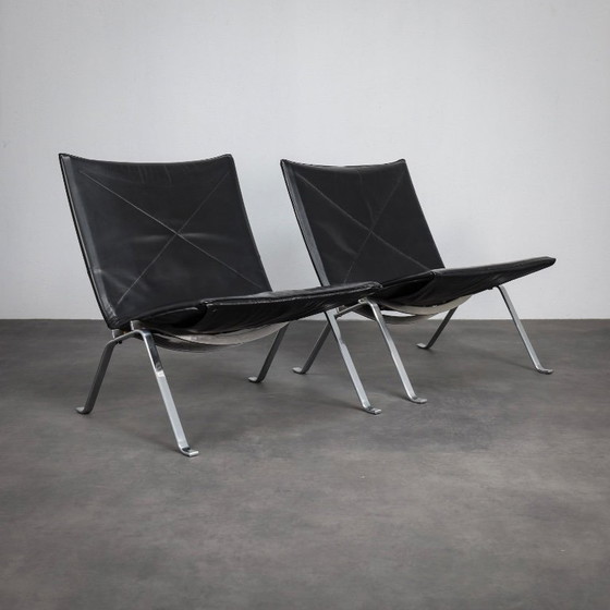 Un par excepcional y muy coleccionable de sillones PK22 antiguos, diseñados en 1958 por Poul Kjærholm y producidos por E. Kold Christensen. Se trata de un raro conjunto de primera edición, procedente del primer propietario, un detalle que realza significativamente tanto su procedencia como su valor histórico.