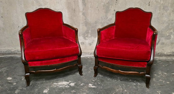 Par de sillones bergère estilo Luis XV, principios del siglo XX. Estructura de madera maciza de haya teñida y tallada con reposabrazos y patas curvas. Tapizado en terciopelo rojo con ribete de tachuelas. Asiento ancho con cojín extraíble. Tela limpia y sin manchas. Ligeras señales de uso en la madera y el terciopelo. Ancho 65 x Alto 79 x Profundidad 72 cm