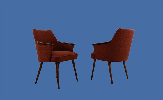 Este par de sillones se fabricó en Polonia en la década de 1960. El respaldo es de contrachapado curvado; durante su renovación, se les añadió un nuevo relleno y una tela de tapicería estructural en un tono terracota oscuro. Las patas y los reposabrazos son de madera de haya, también restaurada. Se aplican gastos de envío de 150 € a los pedidos enviados a Países Bajos, Alemania, Bélgica, París y el norte de Francia. Para otros destinos, contáctenos para solicitar un presupuesto de envío.