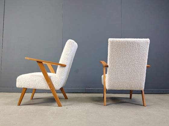 Pareja de sillones de madera de mediados de siglo con una nueva y fresca tapicería de bouclé.