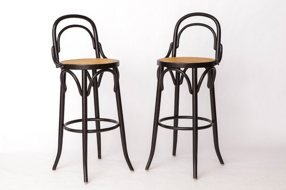 Par de taburetes de bar de madera curvada con asientos de caña vienesa en estilo Thonet - Fabricante desconocido Probablemente producción italiana, que data de la década de 1980-1990. El precio es por el par. Estructuras de madera maciza de haya, pintadas de negro. Asientos originales de caña vienesa en excelentes condiciones. En general, muy buen estado vintage. Más detalles disponibles a petición. Dimensiones: Altura: 94 cm (37,01 pulgadas) Anchura: 35 cm (13,78 pulgadas) Profundidad: 35 cm (13,78 pulgadas) Altura del asiento: 71 cm (27,96 pulgadas) 📦 Envío asegurado a todo el mundo 🚚 Plazos de entrega: • 1-2 semanas dentro de Europa • 3-5 semanas en todo el mundo (América del Norte y del Sur, Asia) ⚡ Envío exprés disponible a petición ✨ ¡Explora más asientos vintage cuidadosamente seleccionados en nuestra tienda! 💬 ¿No estás seguro de qué sillas vintage se adaptarán a tu espacio? Envíame una foto de tu comedor o sala de estar y estaré encantado de sugerirte un juego de 4 o 6 sillas cuidadosamente seleccionado para combinar con tu estilo. 📸🪑