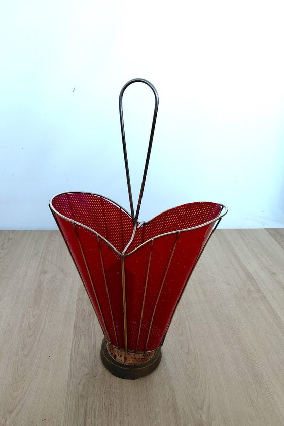 Bonito paragüero de los años 50 nota 1 barra esta un poco torcida y hay un rasgón en el plástico rojo por lo demás en buen estado ver fotos