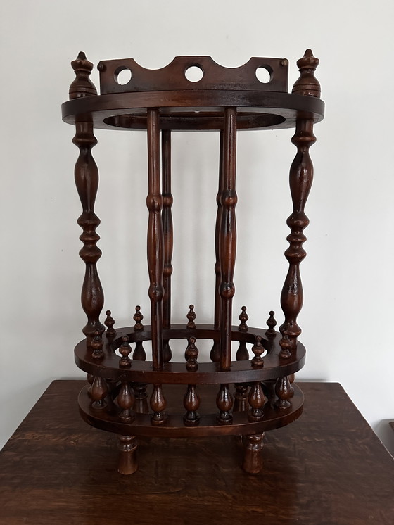 Este elegante paragüero o perchero de madera es un bello ejemplo de la artesanía de finales del siglo XIX y principios del XX. Fabricado íntegramente en madera torneada, la pieza presenta refinados balaustres y dos anillos abiertos que le aportan ligereza y estabilidad.