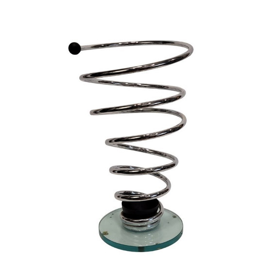 Divertido paragüero en espiral de diseño italiano de los años 80, en estilo Mid-Century. La pieza se estructura a partir de una dinámica espiral de acero cromado que se eleva desde una base circular de vidrio. Este contraste entre la transparencia del cristal y el brillo metálico confiere al objeto un aire sofisticado y moderno.