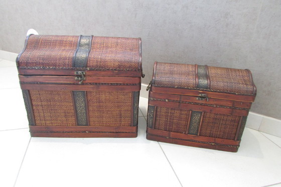 2 baúles con tesoros para anidar, de ratán, mimbre tejido, chapa de latón y asas de latón sobre bastidor de madera. De bella factura, muy decorativos.