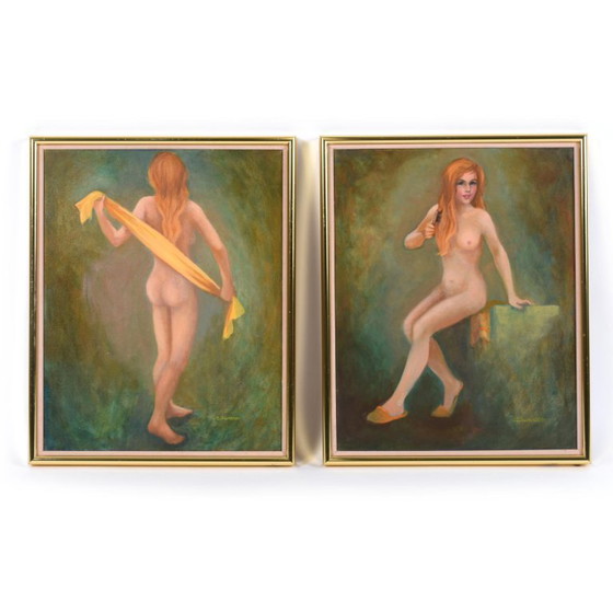 Pareja de cuadros dorados verdes de musas desnudas femeninas de Swanson