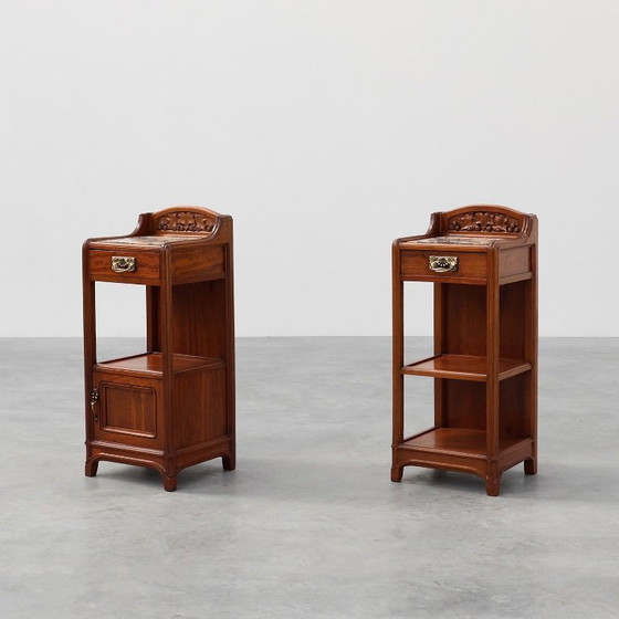 Pareja de mesillas de noche Art Nouveau con tapa de mármol de Paul Alexandre Dumas, Francia ca. 1910