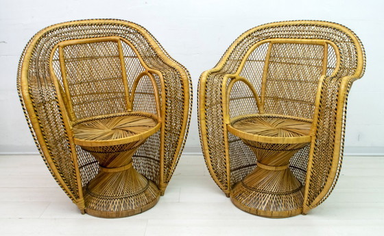 Este par de sillones de mimbre fueron fabricados en los años setenta por la famosa empresa francesa Kok Maison, y anunciados en una película de los setenta del mismo nombre, Emmanuelle.