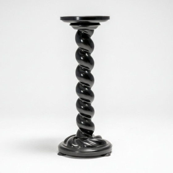 El pedestal está elaborado en madera de nogal y acabado en laca negra, una combinación frecuente a principios del siglo XX para evocar la riqueza de las formas barrocas, manteniendo al mismo tiempo una refinada presencia arquitectónica. La columna en espiral proporciona dinamismo visual y estabilidad estructural, lo que lo hace ideal para exhibir plantas, esculturas u objetos decorativos.