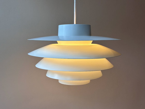 Se vende lámpara colgante Verona de Sven Middelboe en versión con 5 pantallas Diseño: Sven MIddelboe Fabricante: Nordisk Solar, Dinamarca Modelo: péndulo Verona con casquillo de porcelana 1xE27 máx. 100 vatios Dimensiones: diámetro 40cm, altura 23cm, con cable textil blanco 180cm Color: blanco por fuera, blanco por dentro y último reflector gris por dentro Material: metal (aluminio) Estado: con signos normales de uso, pequeños bordes a tope, algo ondulado Se vende sin bombillas Estado: muy buen estado, ver fotos Precio por 1 lámpara Verona, ¡hay más disponibles!